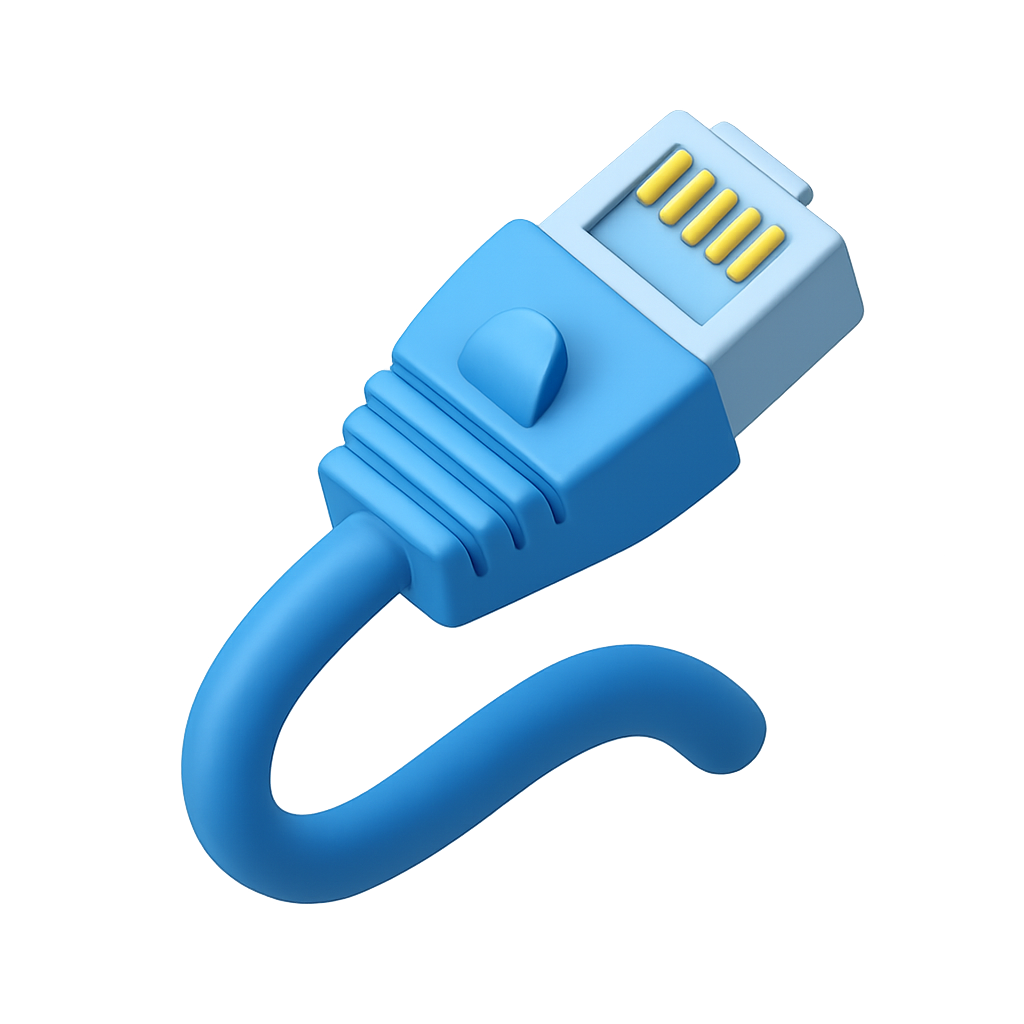 A visually striking 3D icon of an Ethernet cable with a plug, depicted in a three-quarter view. The design features a blue cable with a smooth, isometric appearance against a transparent background.