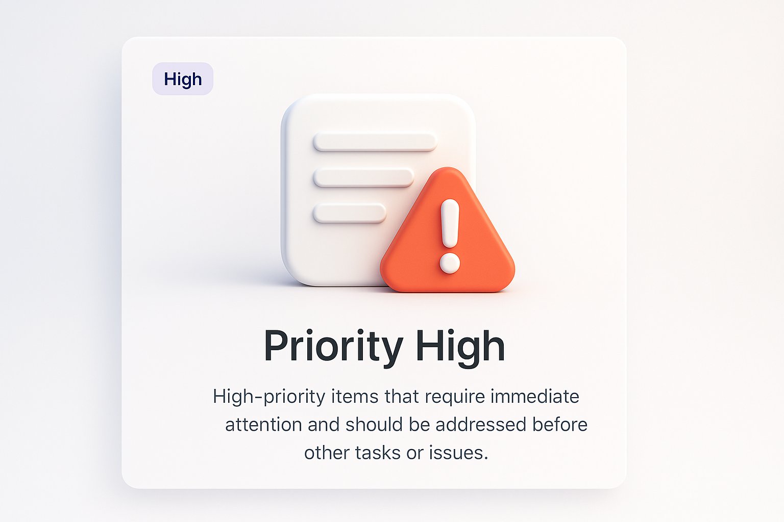 A 3D web page design featuring a high priority notification with an alert icon and descriptive text. The background has a smooth gradient, enhancing the visual appeal.