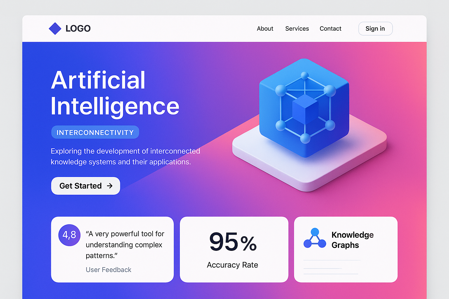 /Collection: /by davooda/Type: PNG/A visually dynamic 3D landing page featuring an AI theme. It includes a logo, action buttons, and sections for user feedback and key metrics, all set against a vibrant gradient background.