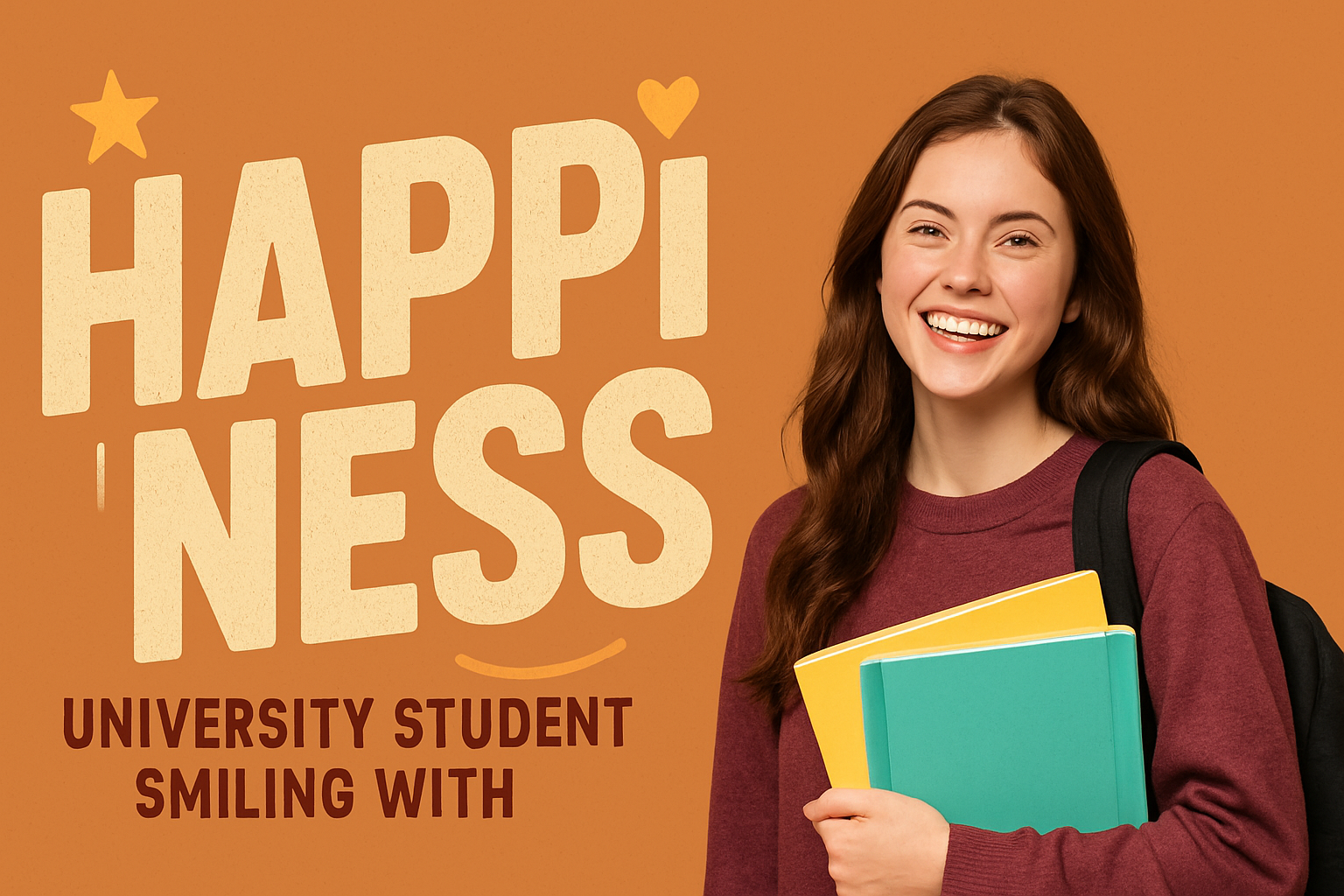 Engaging promotional image featuring a smiling university student holding notebooks, designed to evoke feelings of joy and positivity. Ideal for educational or motivational content.