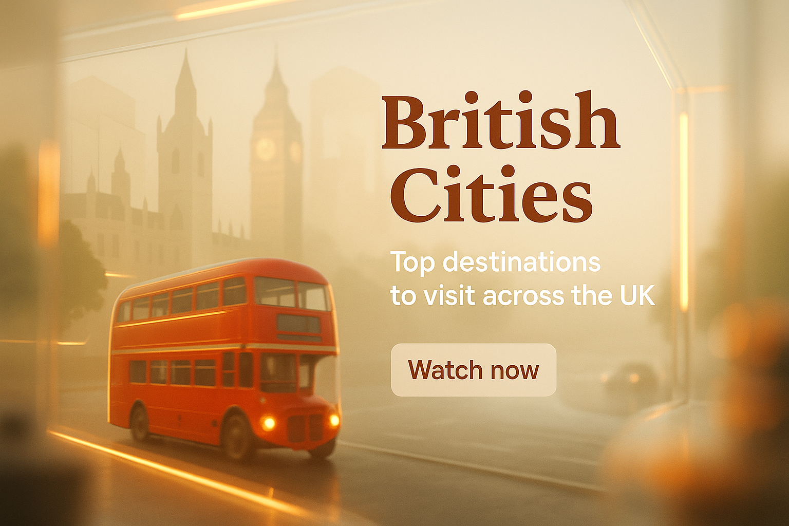 Visually appealing promotional graphic showcasing British cities, featuring a vintage bus and a soft, atmospheric background, ideal for travel marketing.