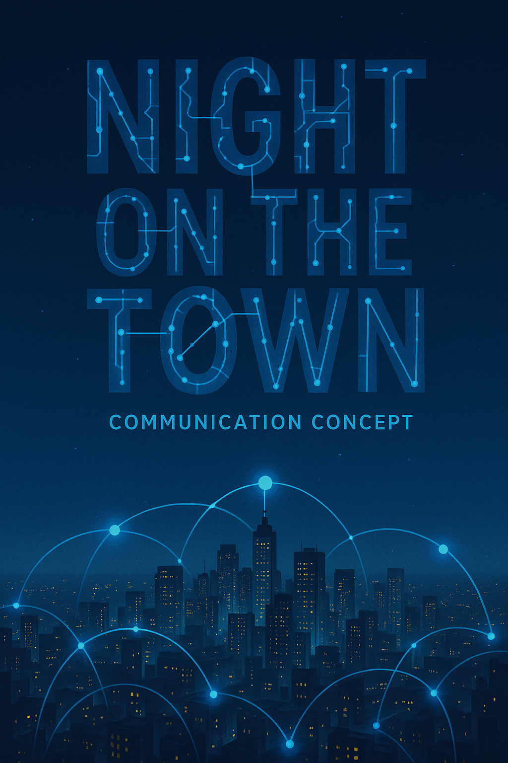 Stylized graphic depicting a nighttime cityscape with a communication theme, featuring glowing typography and network connections. Ideal for tech-related presentations or promotional materials.