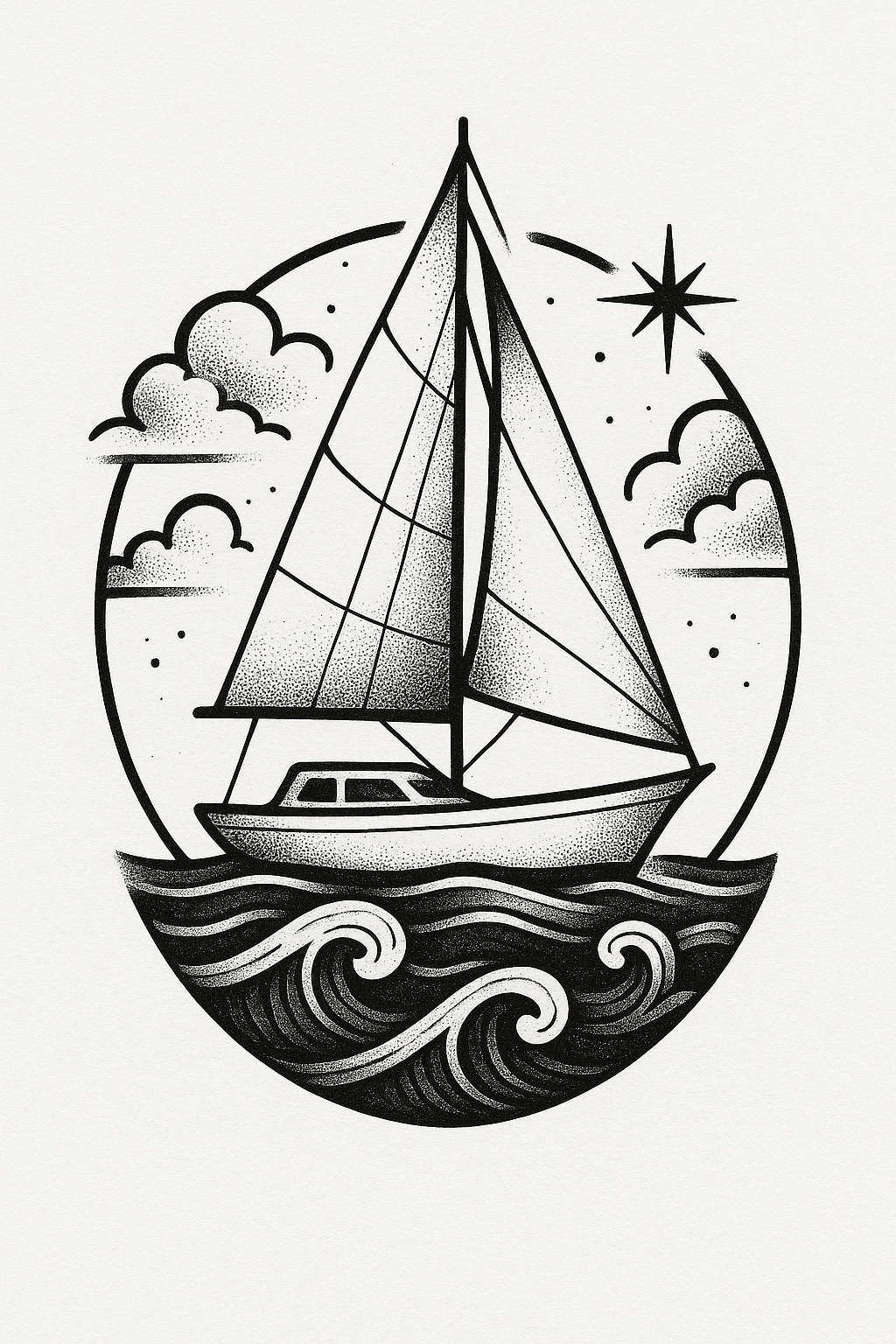/Collection: /by davooda/Type: PNG/This is a black and white illustration of a sailboat surrounded by waves and clouds, ideal for nautical-themed designs or artwork. The graphic features a clean, minimalistic style.