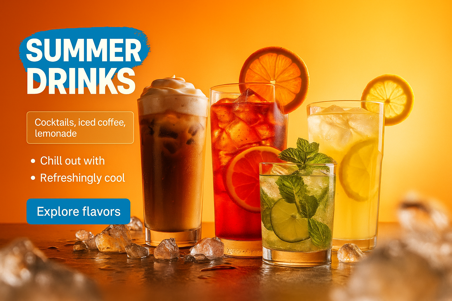 /Collection: /by davooda/Type: PNG/A vibrant display of summer cocktails, including iced coffee and lemonade, set against a warm gradient background. The drinks are garnished with fruits and mint, evoking a refreshing feel.