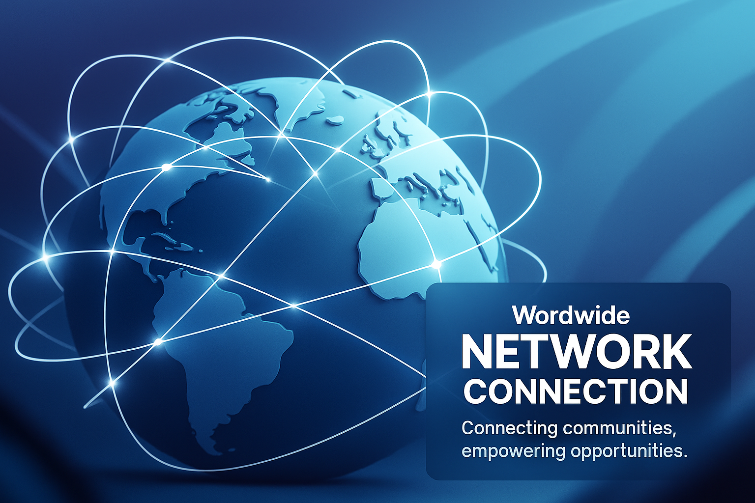 /Collection: /by davooda/Type: PNG/A digital art illustration showcasing a globe connected by luminous lines, symbolizing global connectivity. The design features a smooth gradient background and clear text elements.