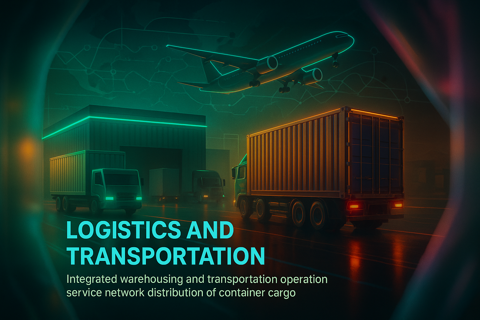 /Collection: /by davooda/Type: PNG/Dynamic digital artwork representing logistics and transportation, featuring trucks and an airplane in a night setting. Ideal for industry-related promotions or presentations.