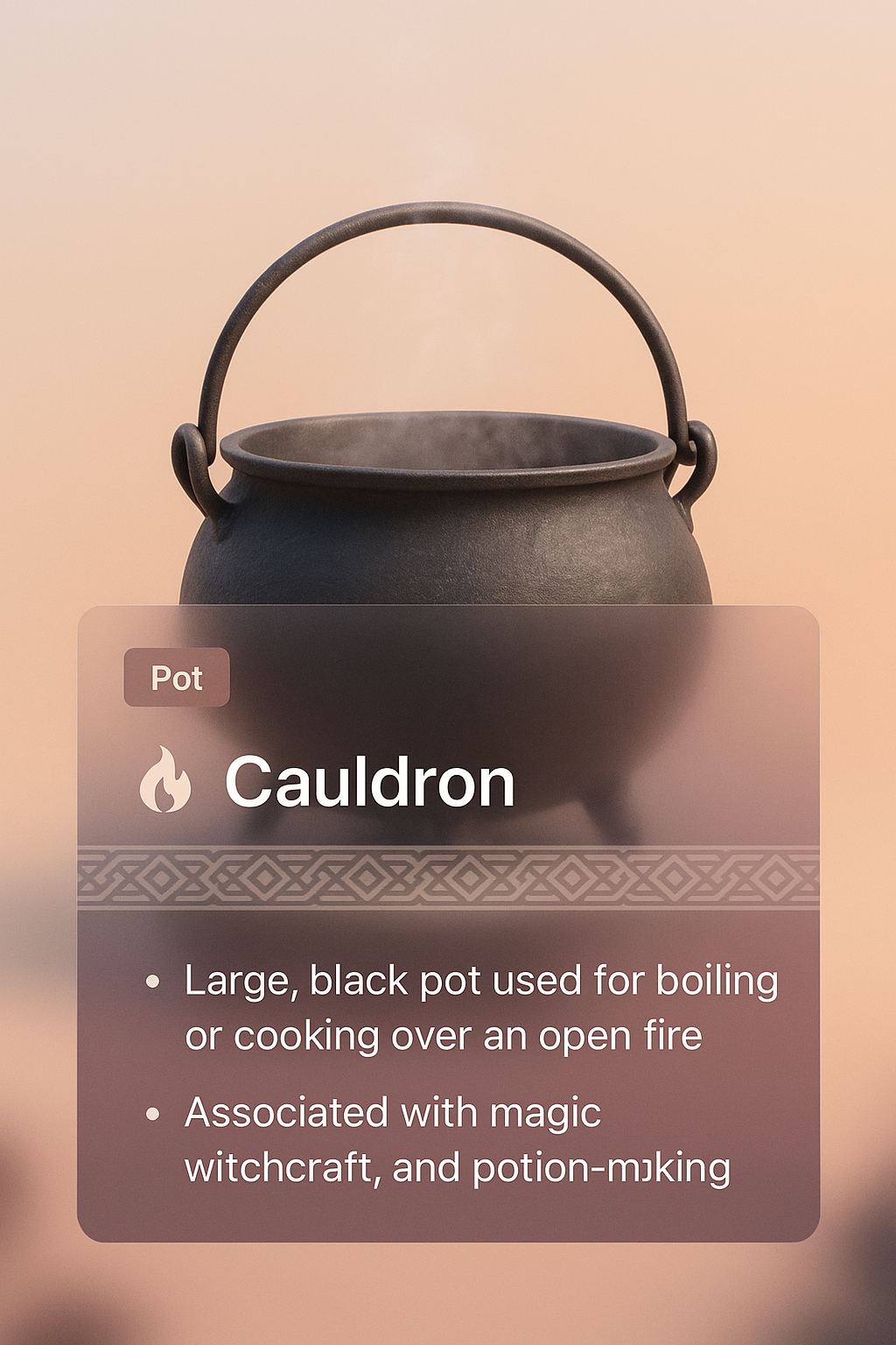 A 3D illustration of a black cauldron with steam rising, integrated with a stylish information panel. The panel features a gradient background and clear text, enhancing the magical theme.