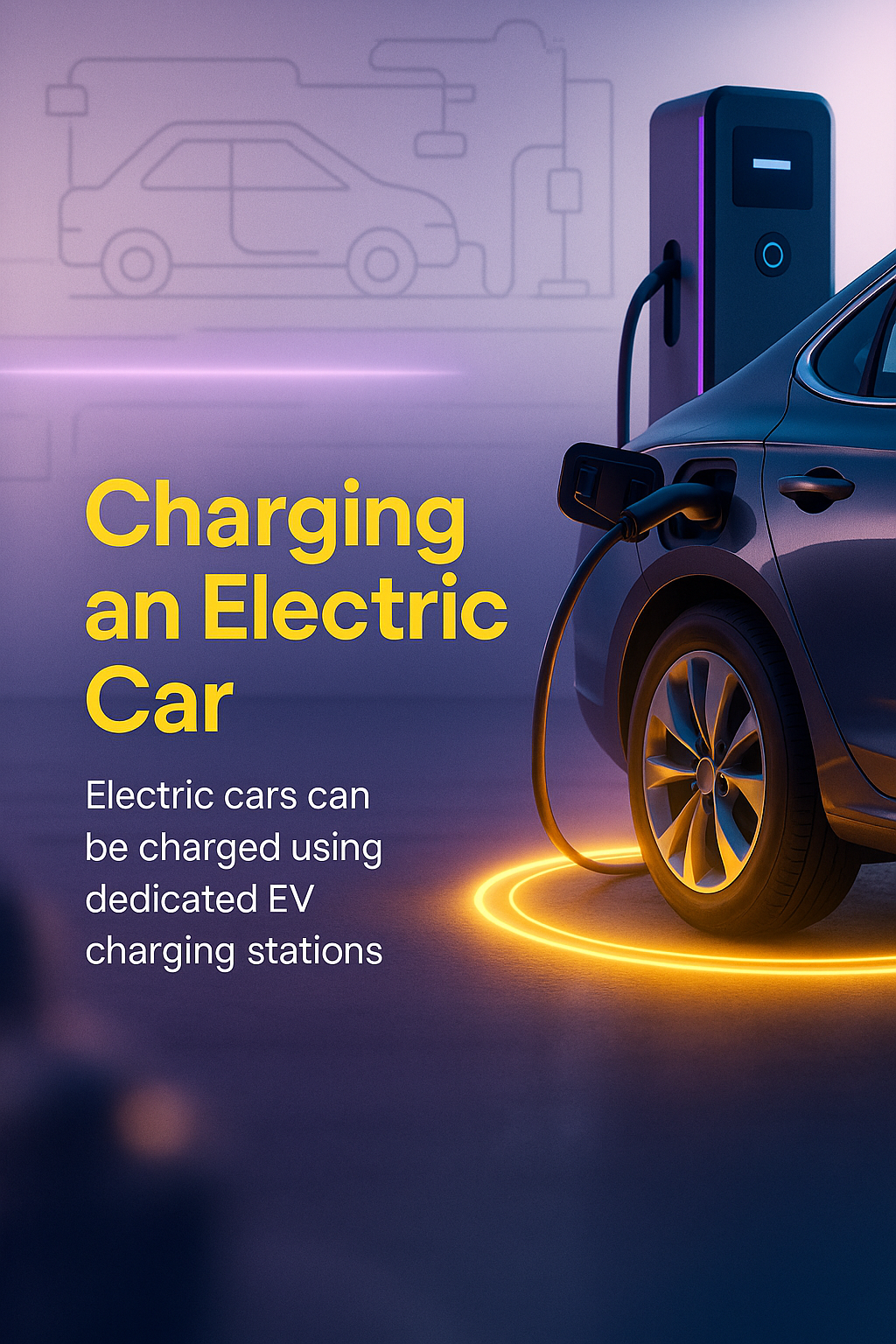 A visually appealing graphic showcasing an electric car connected to a charging station, emphasizing the concept of sustainable transportation. Ideal for educational or promotional materials on electric vehicles.