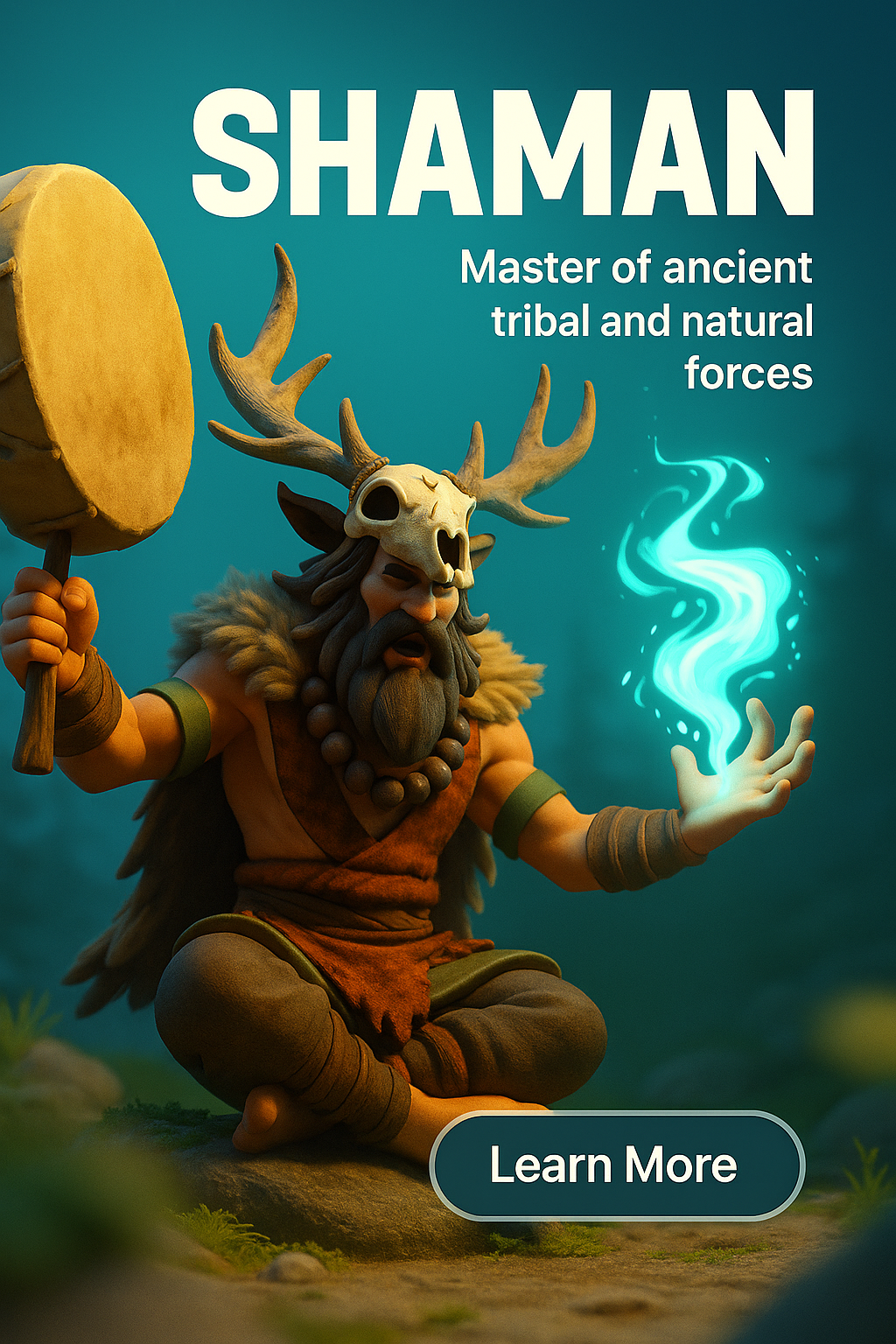 A striking 3D illustration of a shaman character, featuring vibrant colors and mystical elements. The shaman holds a drum and conjures energy, set against a gradient background.