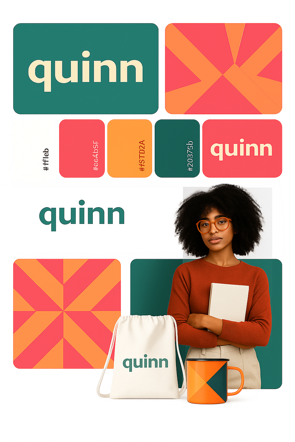 /Collection: /by davooda/Type: PNG/A vibrant brand material redesign showcasing geometric patterns and colors. Features the name 'quinn' in various formats alongside a model holding a notebook.