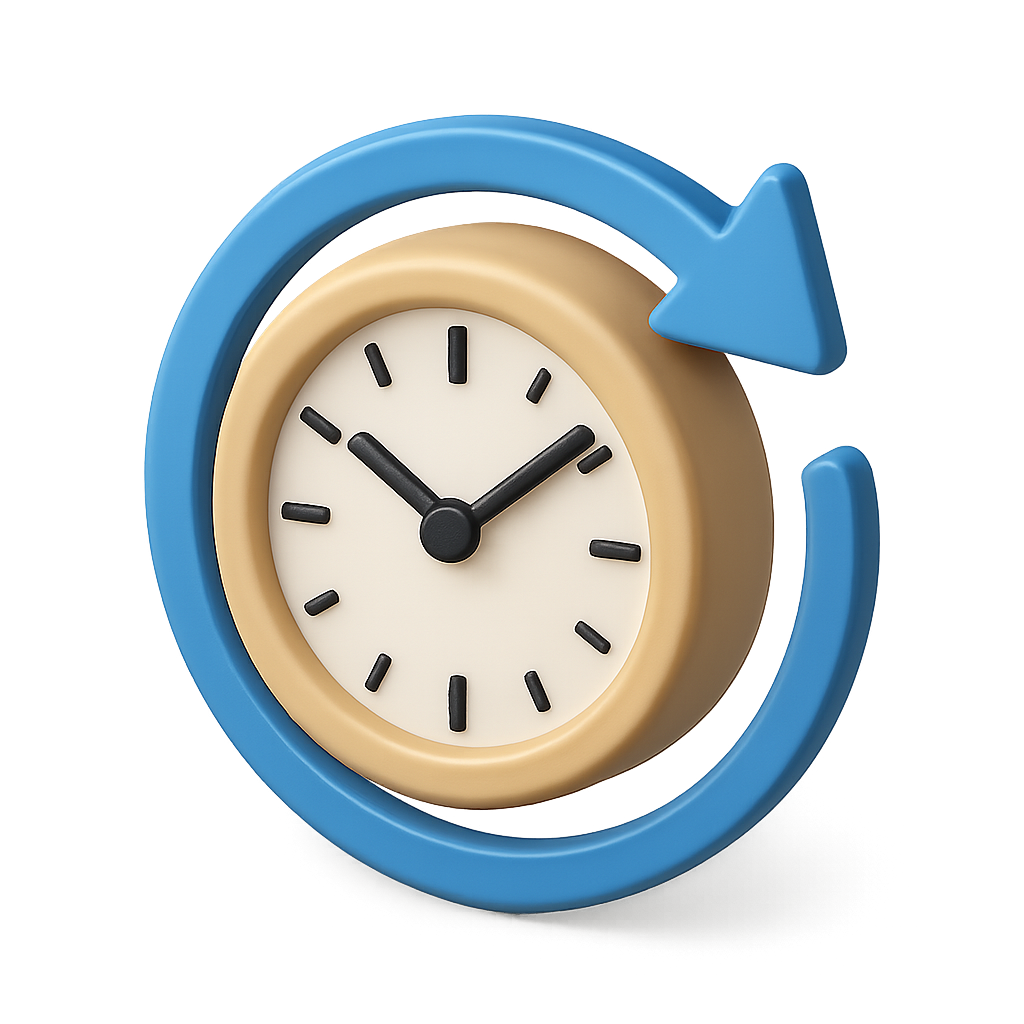 /Collection: /by davooda/Type: PNG/A visually appealing 3D clock icon featuring a circular arrow. The clock has a beige face and black hour and minute hands, all presented in a three-quarter isometric view.