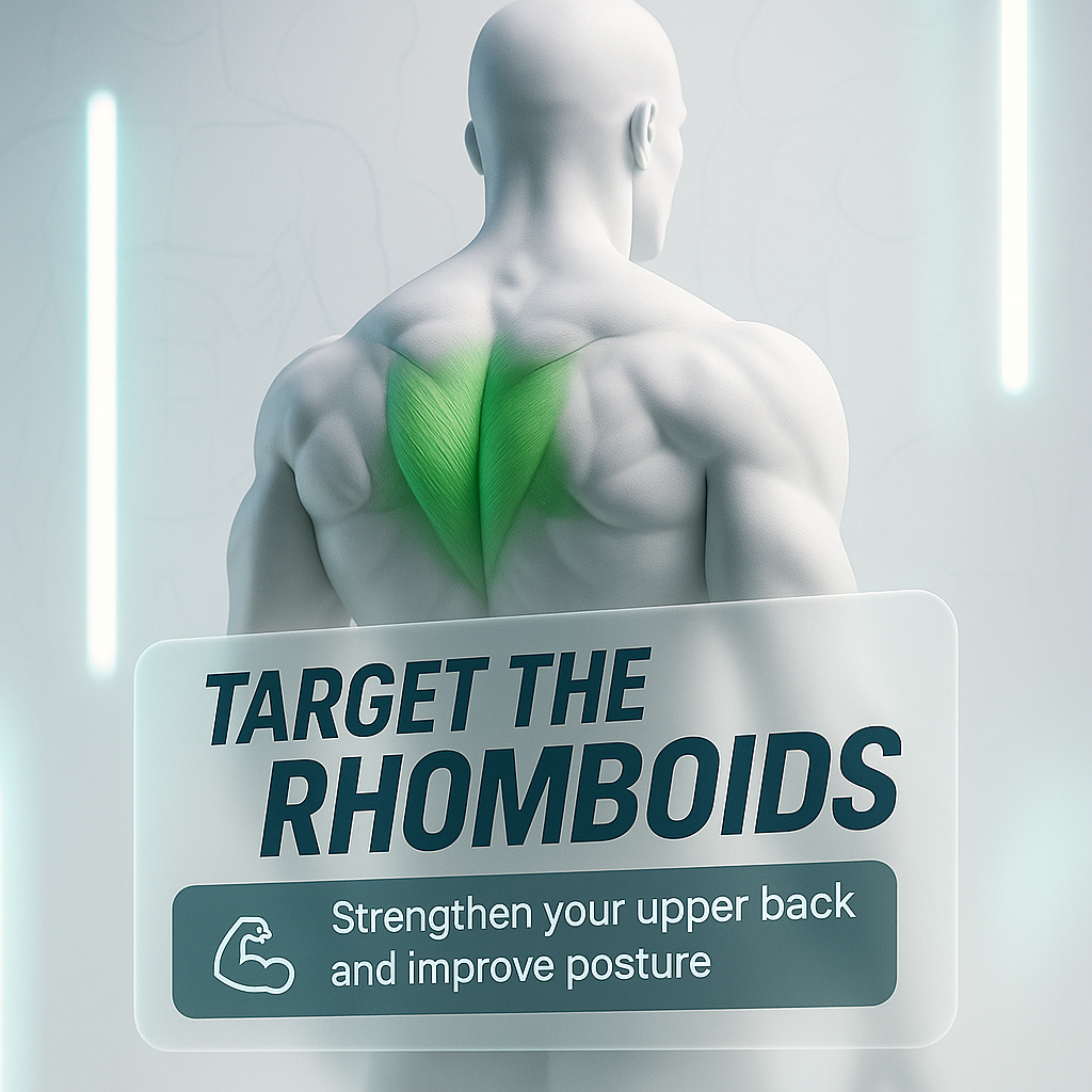 /Collection: /by davooda/Type: PNG/An informative 3D illustration highlighting the rhomboid muscles, aimed at promoting upper back strengthening and posture improvement. Ideal for fitness and health content.