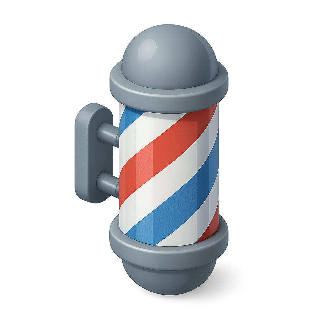 A visually appealing 3D icon of a barber pole featuring red, white, and blue stripes. The design is isometric and volumetric, with a smooth, glossy finish and transparent background.