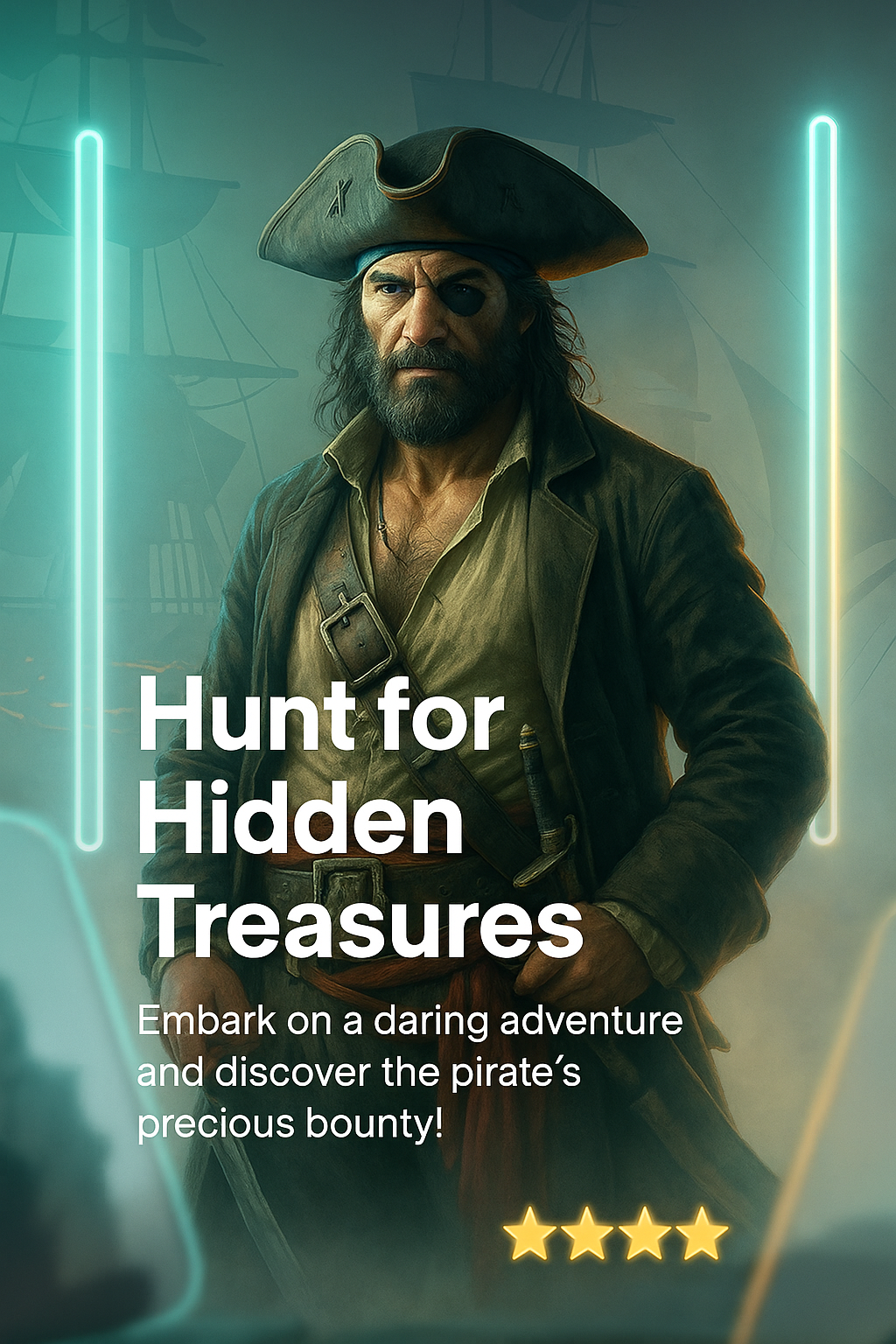 A stunning neon-themed slide design featuring a pirate character, with glowing elements and layered composition, showcasing a call-to-action for treasure hunting.