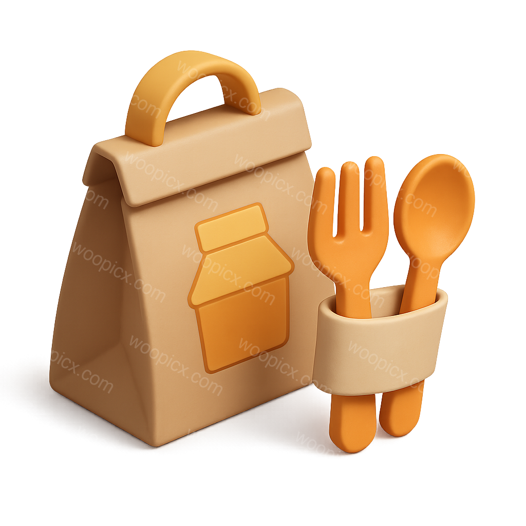 A visually appealing 3D icon featuring a food delivery package alongside utensils. The design has a transparent background and showcases a three-quarter isometric view with a warm color palette.