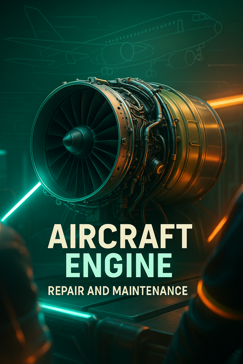 /Collection: /by davooda/Type: PNG/A visually striking graphic showcasing a detailed aircraft engine, emphasizing repair and maintenance themes. The design features modern elements and vibrant lighting, suitable for aviation-related educational materials.