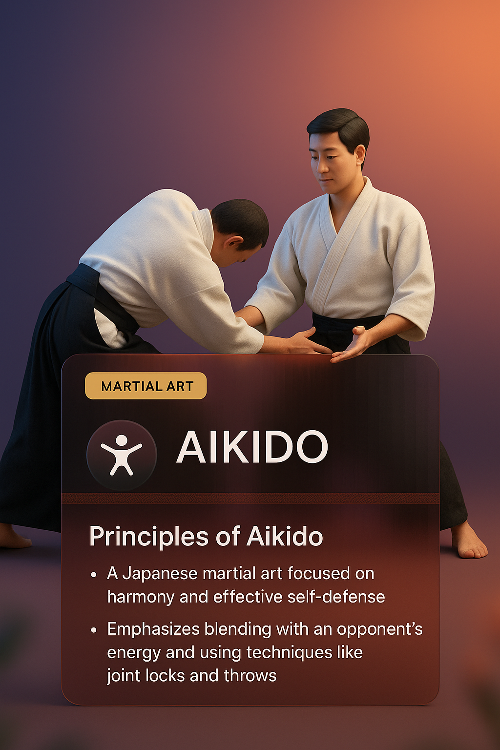 /Collection: /by davooda/Type: PNG/The image features a 3D illustration of two Aikido practitioners demonstrating a technique. An integrated information panel provides key insights into Aikido principles, enhancing the visual appeal.