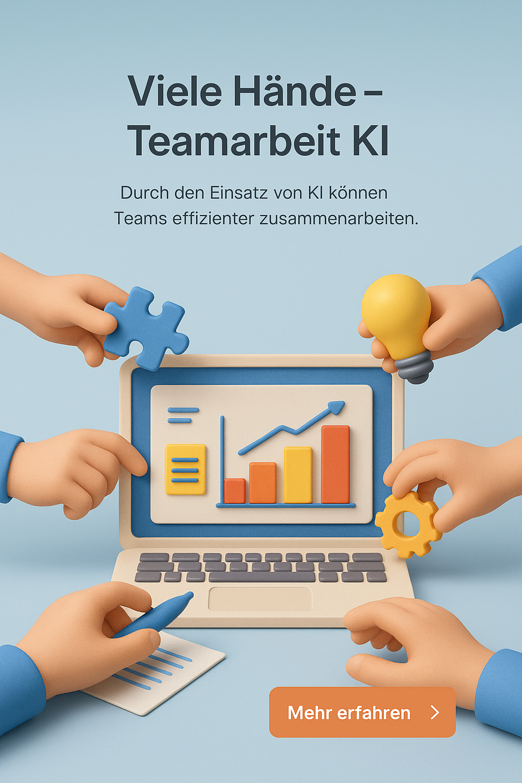 /Collection: /by davooda/Type: PNG/A detailed 3D illustration showing multiple hands engaged in teamwork around a laptop. The scene is zoomed out, providing a full view of the collaborative effort. Bright colors and minimalistic elements enhance readability.