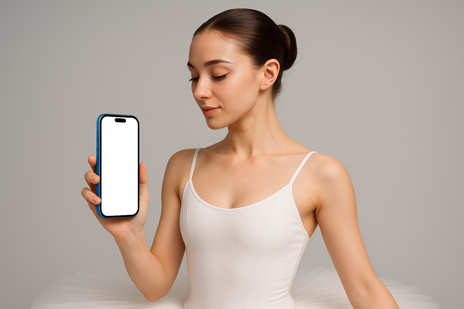 /Collection: /by davooda/Type: PNG/A graceful ballerina in a white tutu holds a blue phone elegantly, showcasing a blank screen. The soft lighting accentuates her poised demeanor and the delicate details of her attire.
