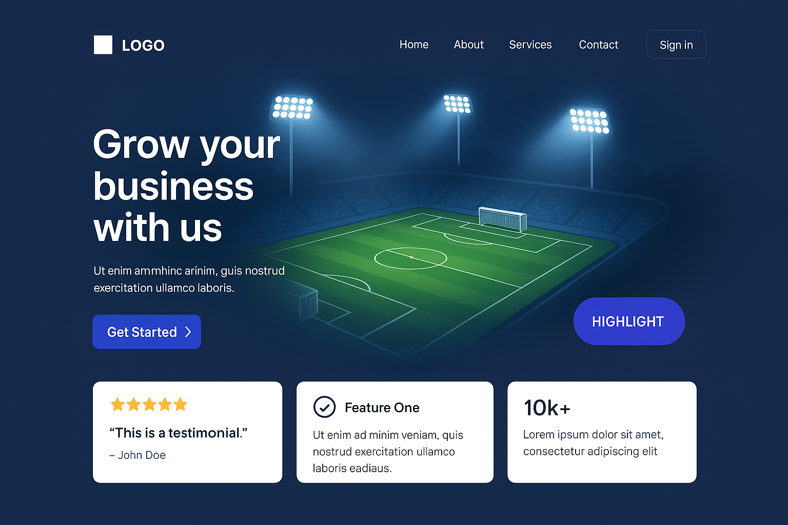 A visually engaging landing page featuring a 3D illustration of a football ground at night, complete with dynamic elements and a modern layout.