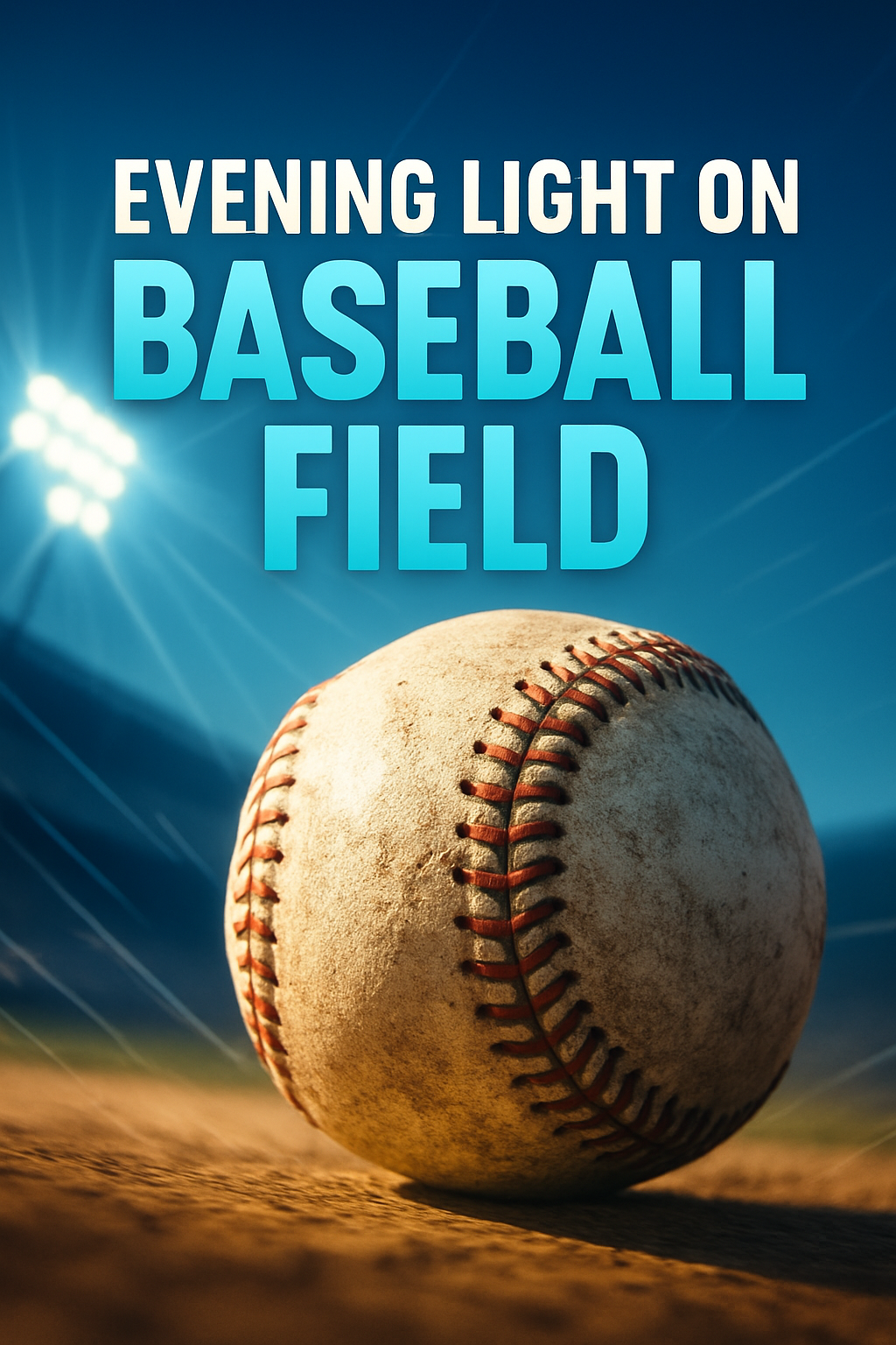 A close-up of an old white baseball captured during an evening game, illuminated by stadium lights. The dynamic composition features layered visual elements and a smooth gradient background.