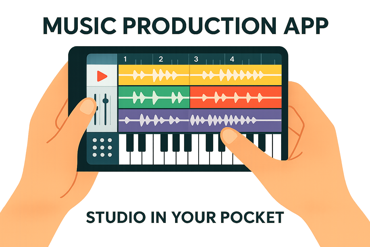 Illustrative graphic featuring a mobile device displaying a music production app interface. Ideal for promoting mobile music creation tools and apps.