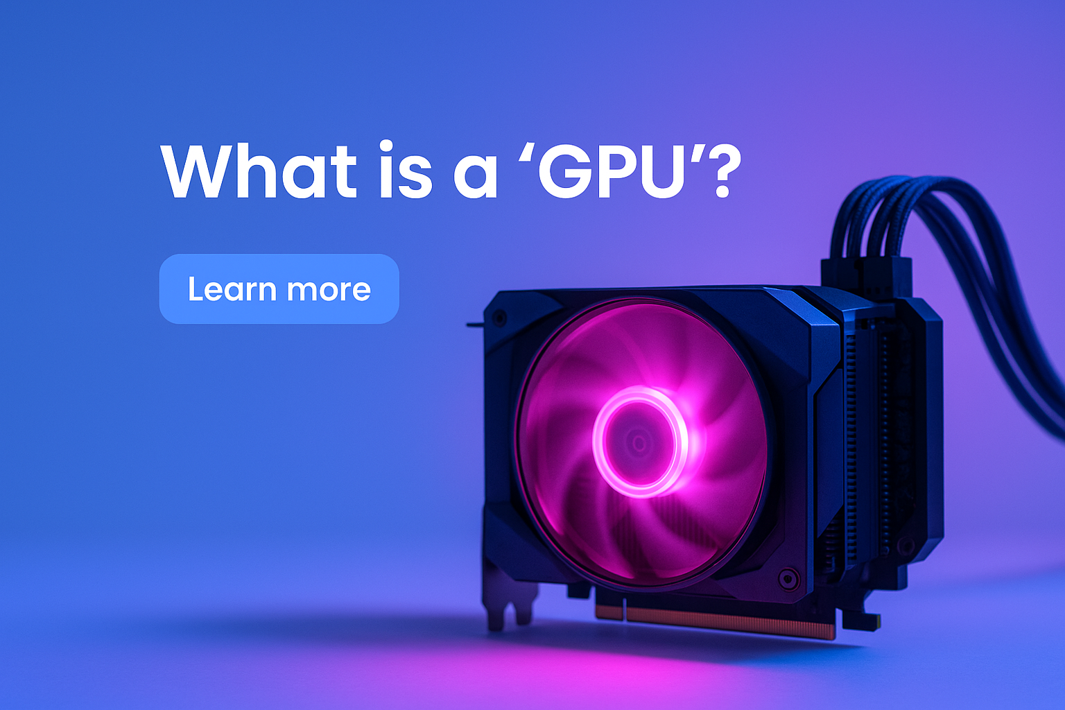 A striking GPU with a glowing neon-pink fan is featured against a solid blue background. The atmosphere is enhanced by cool shades of blue to violet, creating a captivating visual.