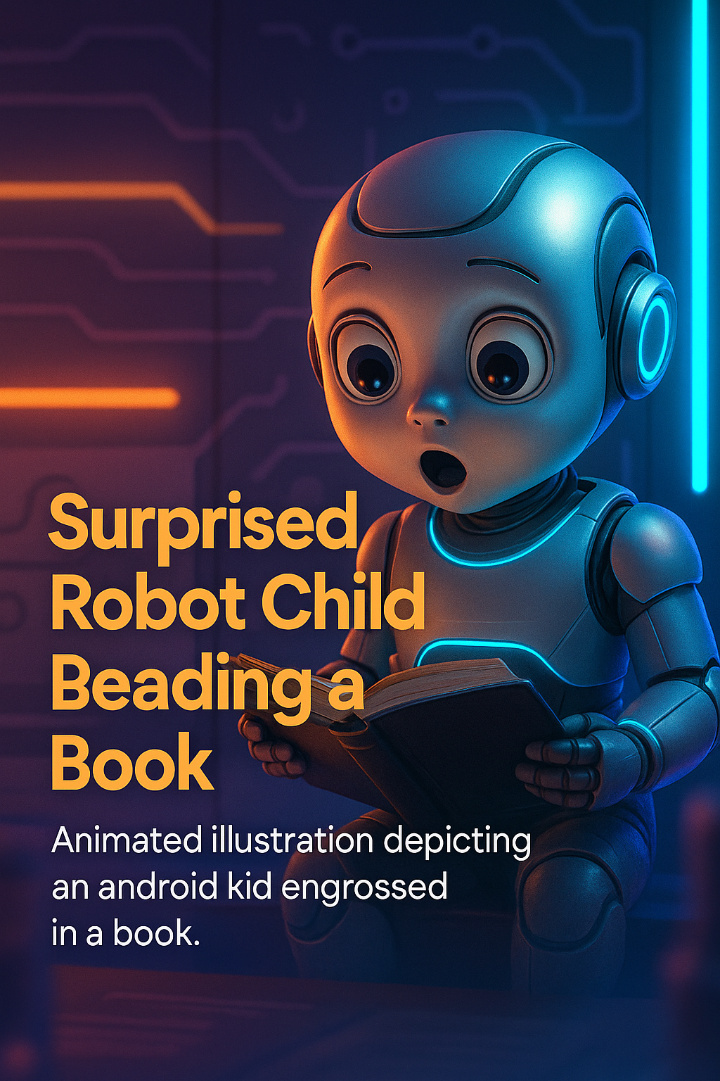 /Collection: /by davooda/Type: PNG/A vibrant animated illustration showcasing a robot child with a surprised expression, deeply engrossed in reading a book. Ideal for children's literature or tech-themed content.
