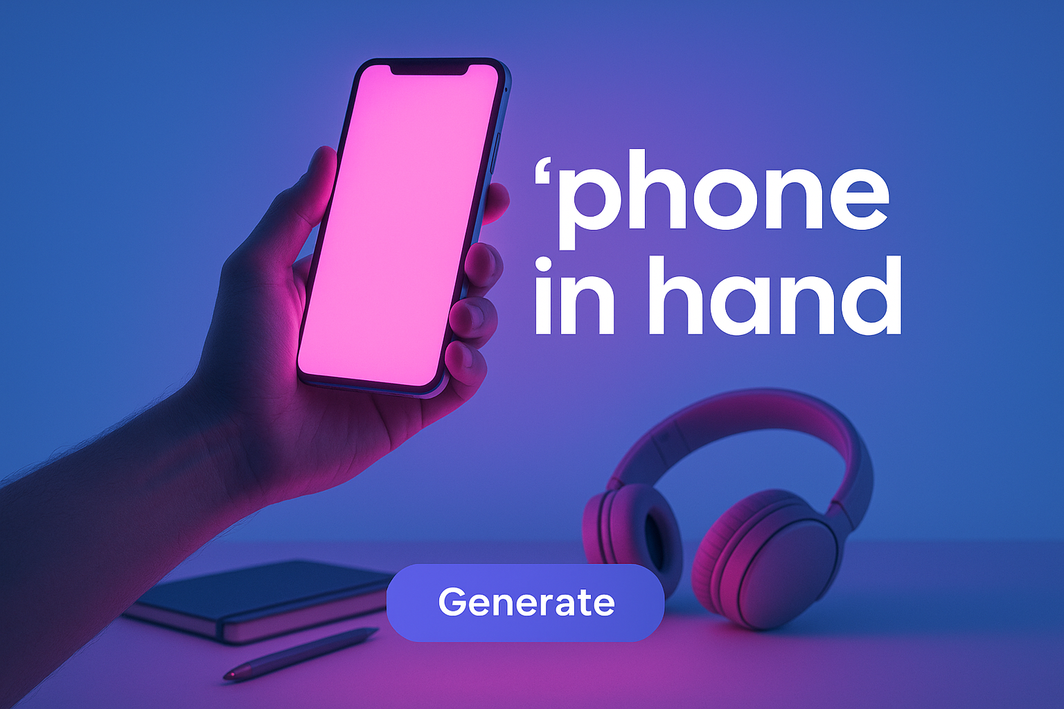 A hand holding a smartphone emits a vibrant neon pink glow, illuminating the scene against a solid blue background. Headphones and a notebook complement the composition.