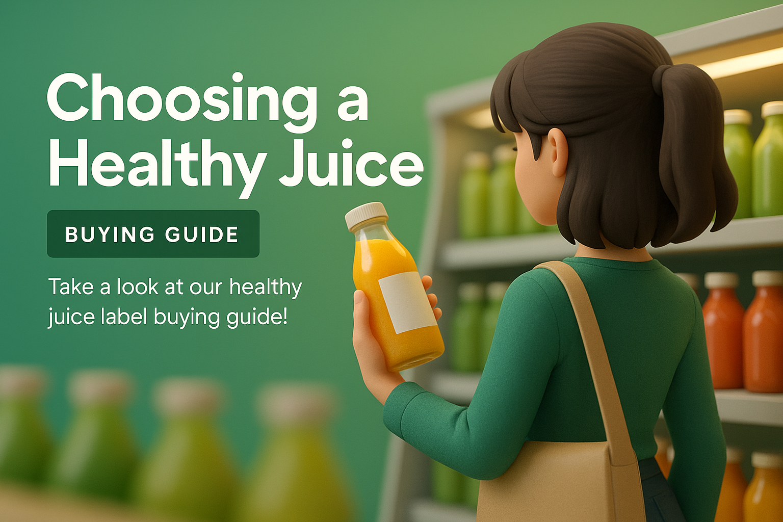 /Collection: /by davooda/Type: PNG/A young woman views a bottle of juice in a grocery store, contemplating her choice. The setting features neatly arranged juice bottles and a clean gradient background.