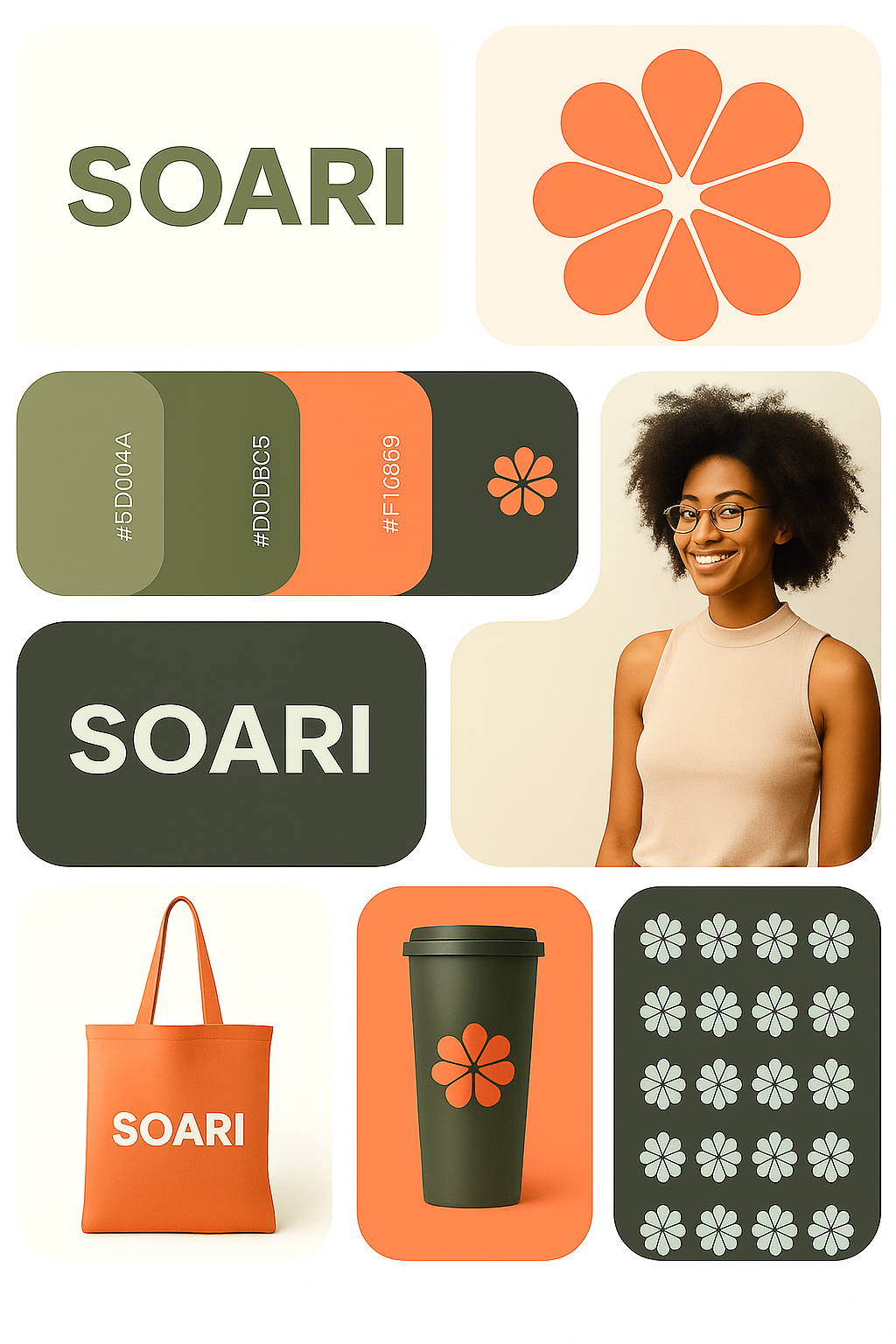 /Collection: /by davooda/Type: PNG/An image showcasing rounded branding blocks featuring the word 'SOARI', a floral design, and color swatches. Includes a model smiling, enhancing the visual appeal.