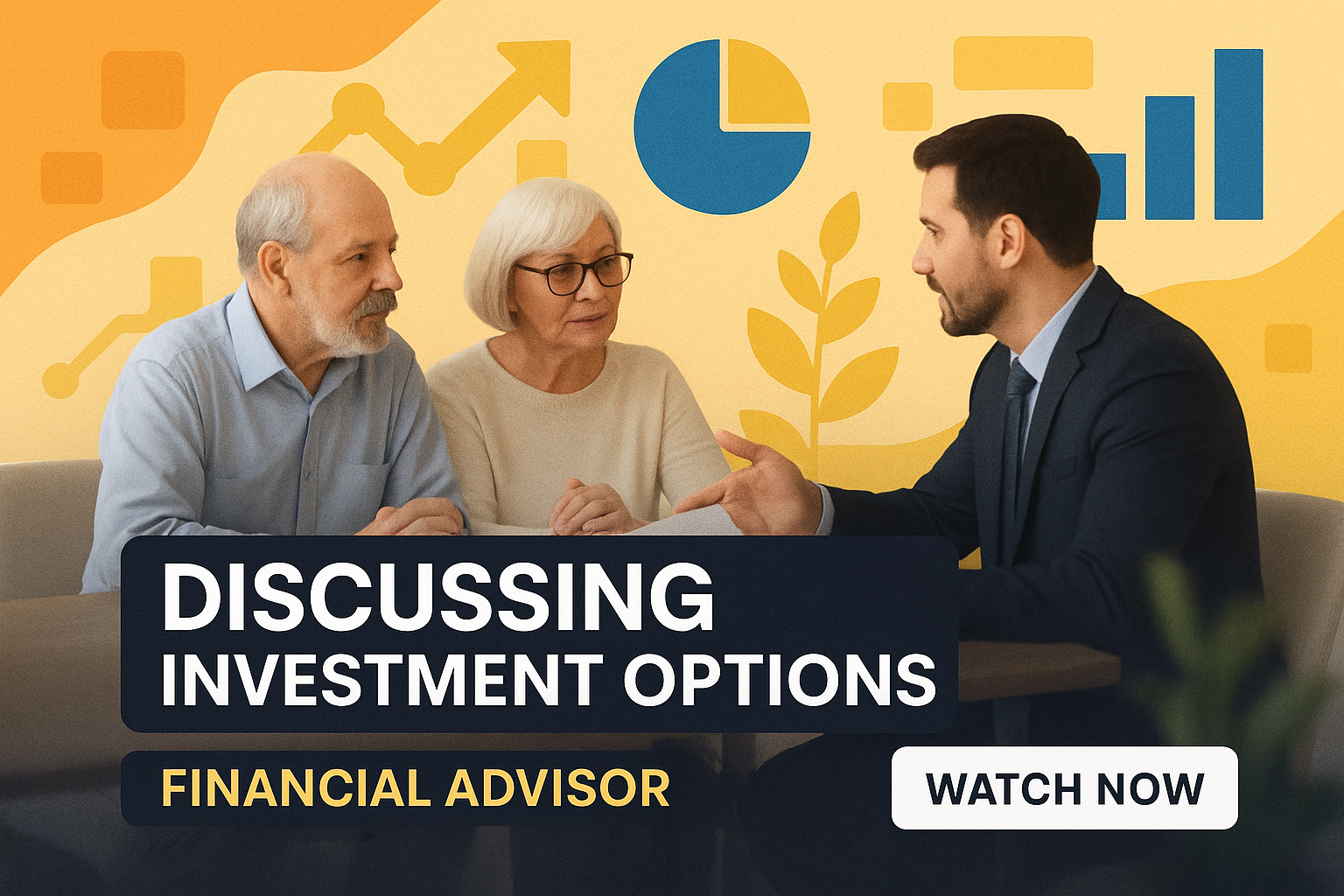 Professional image depicting a financial advisor discussing investment options with a couple, featuring modern design elements suitable for marketing materials.