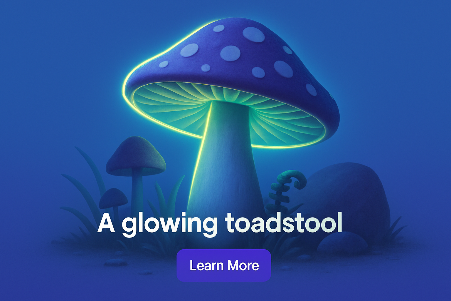 /Collection: /by davooda/Type: PNG/This enchanting image features a radiant toadstool illuminated by soft fluorescent light, set against a solid blue background. The scene is enriched with subtle shadow play and gentle green hues.