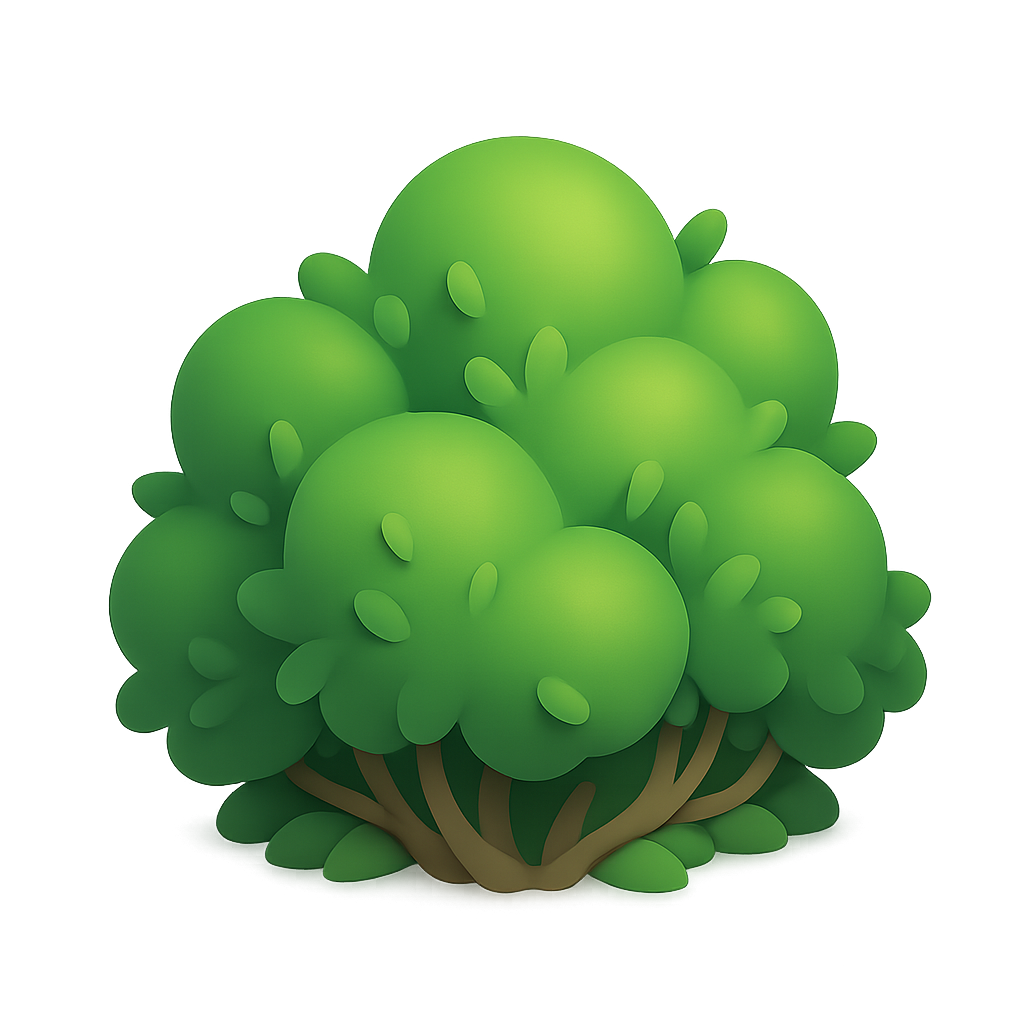 A stylized 3D icon of dense shrubs displayed in a three-quarter isometric view. The shrub features rounded foliage and a vibrant green color against a soft gradient background.