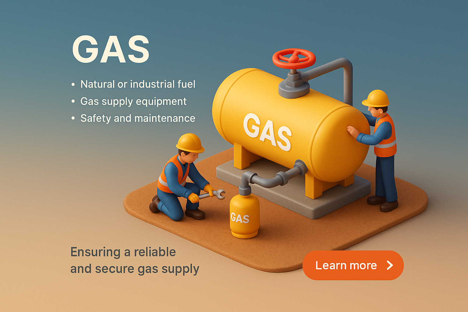 /Collection: /by davooda/Type: PNG/A high-resolution 3D illustration showing workers interacting with gas supply equipment. The scene captures a zoomed-out view, emphasizing scale with vibrant colors and clear text elements.