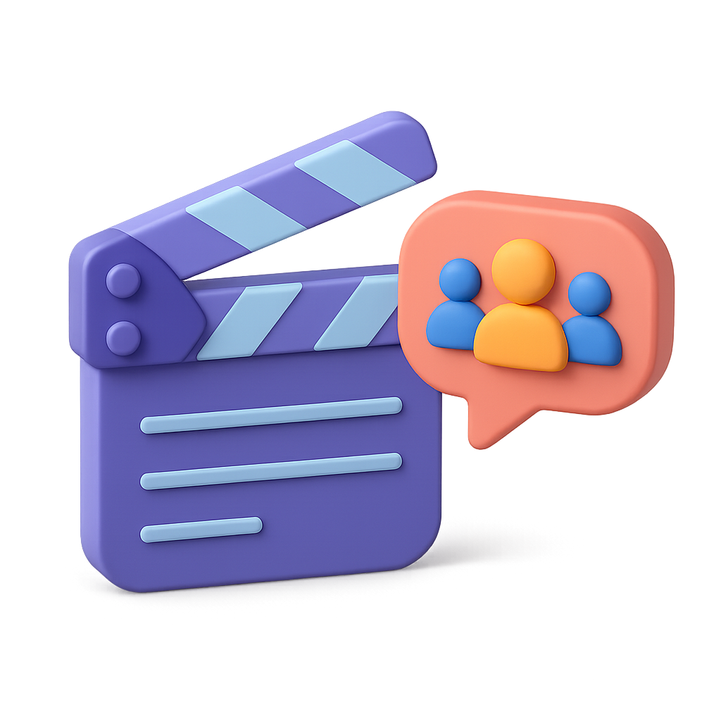 A colorful, volumetric 3D icon featuring a film clapboard alongside a chat bubble with silhouettes of people, all rendered in a striking three-quarter view.