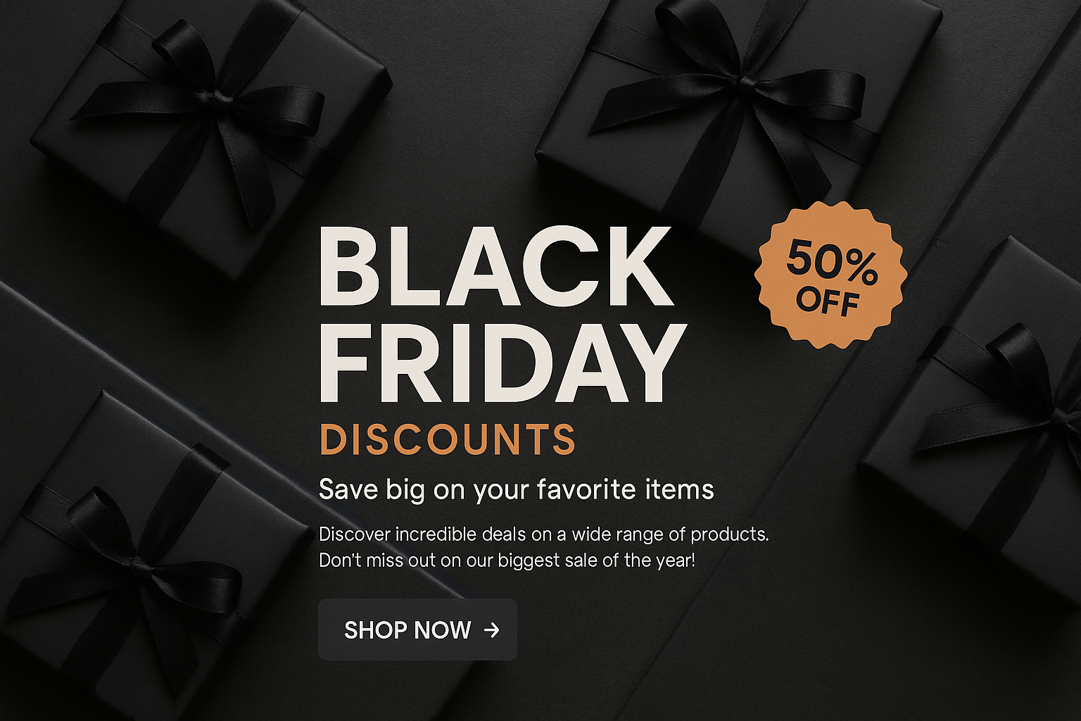 /Collection: /by davooda/Type: PNG/A visually striking arrangement of black gift boxes on a dark background, emphasizing Black Friday discounts. The composition features contrasting text elements and a balanced layout.