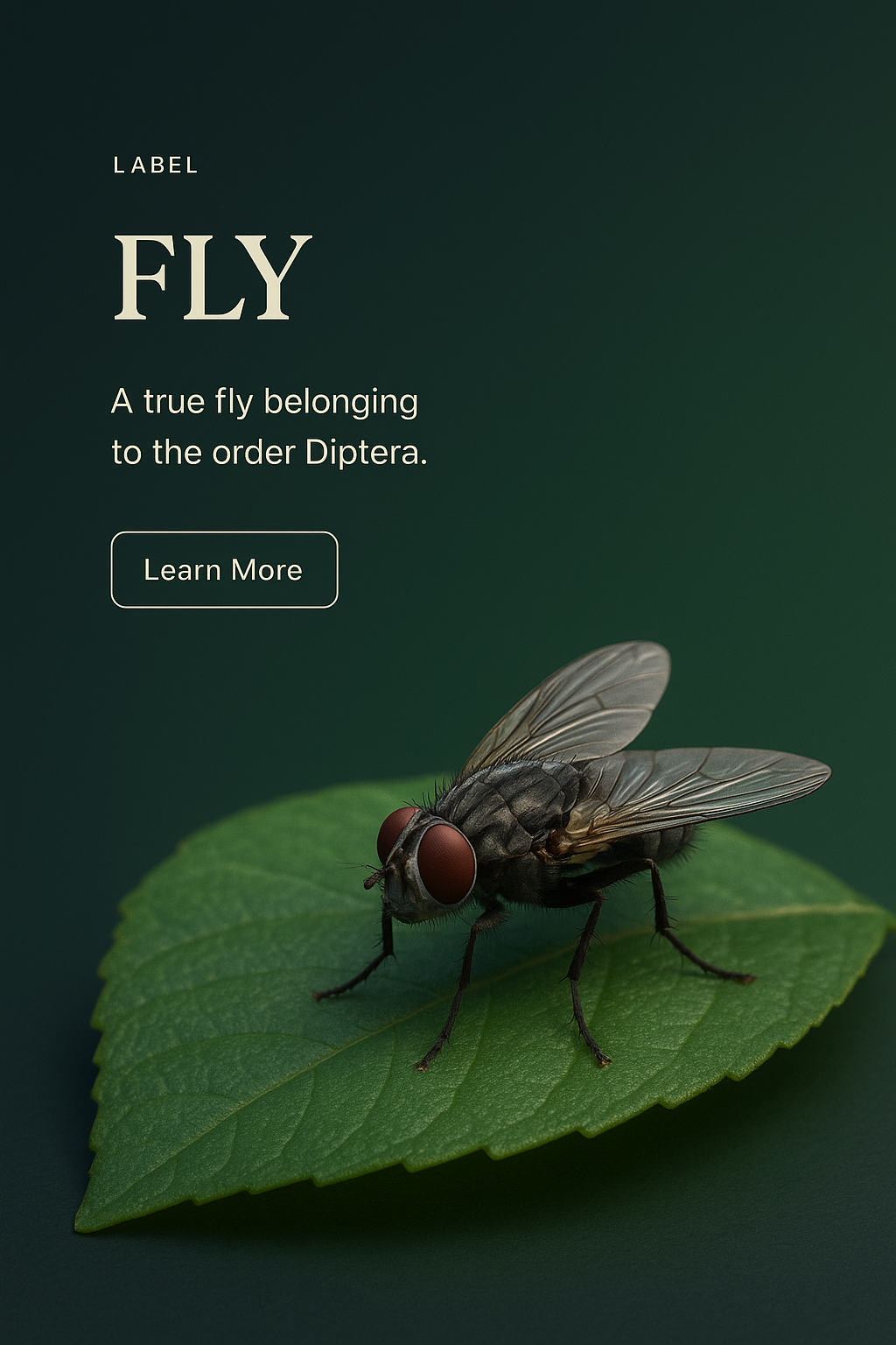 /Collection: /by davooda/Type: PNG/A realistic 3D depiction of a fly perched on a green leaf against a dark gradient background. The scene emphasizes the fly's details in a zoomed-out perspective.