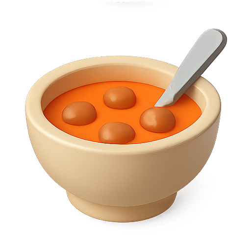 A digital illustration of a bowl filled with orange soup and dumplings, featuring a spoon. The design is playful and vibrant, suitable for food-related content.
