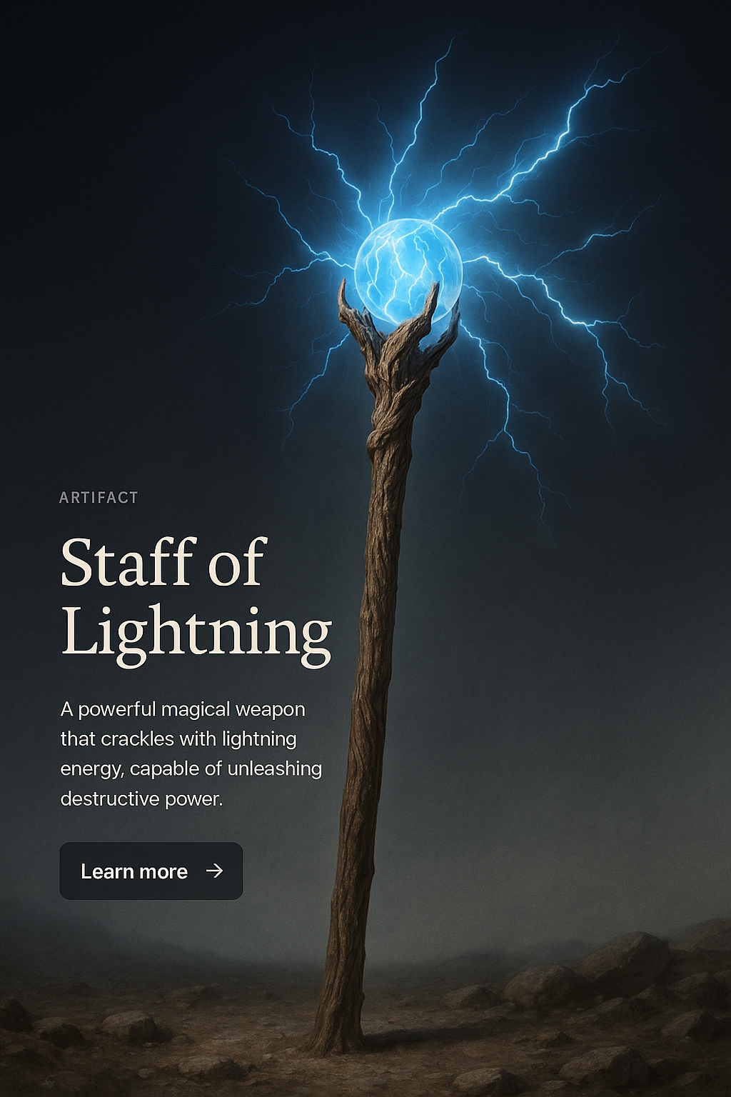 An illustration featuring a staff emitting lightning energy, showcasing its magical power. The design includes a gradient background and a clear action button.