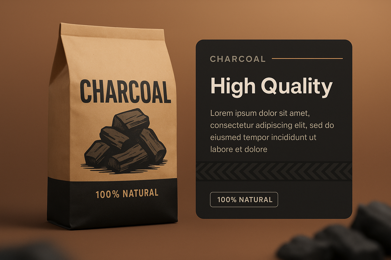 /Collection: /by davooda/Type: PNG/This image features a 3D illustration of a charcoal bag with a sleek design. The bag showcases the word 'CHARCOAL' prominently, emphasizing quality and natural ingredients.