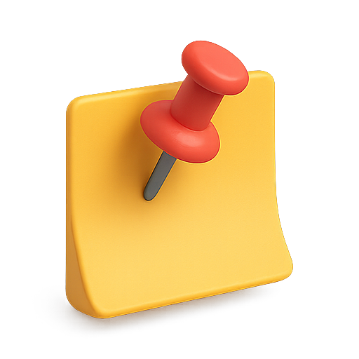 A 3D illustration of a yellow sticky note with a red push pin, ideal for use in digital applications, reminders, or organizational tools.