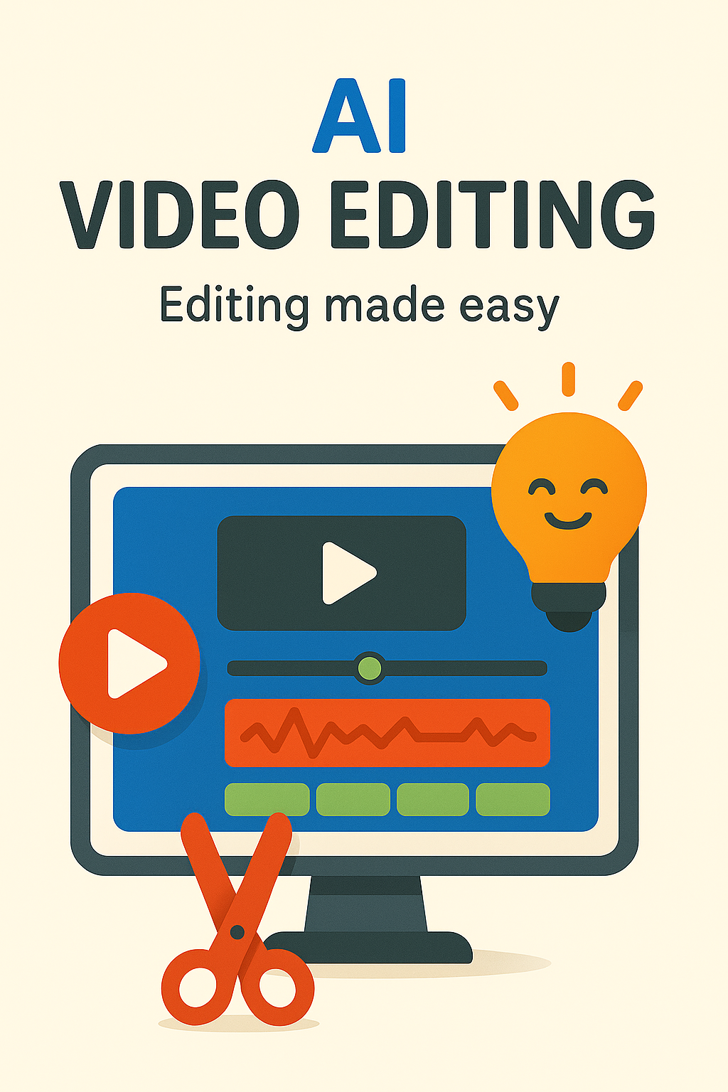 Colorful graphic illustrating AI video editing with a computer screen, playful icons, and a lightbulb, suitable for tech or software marketing.