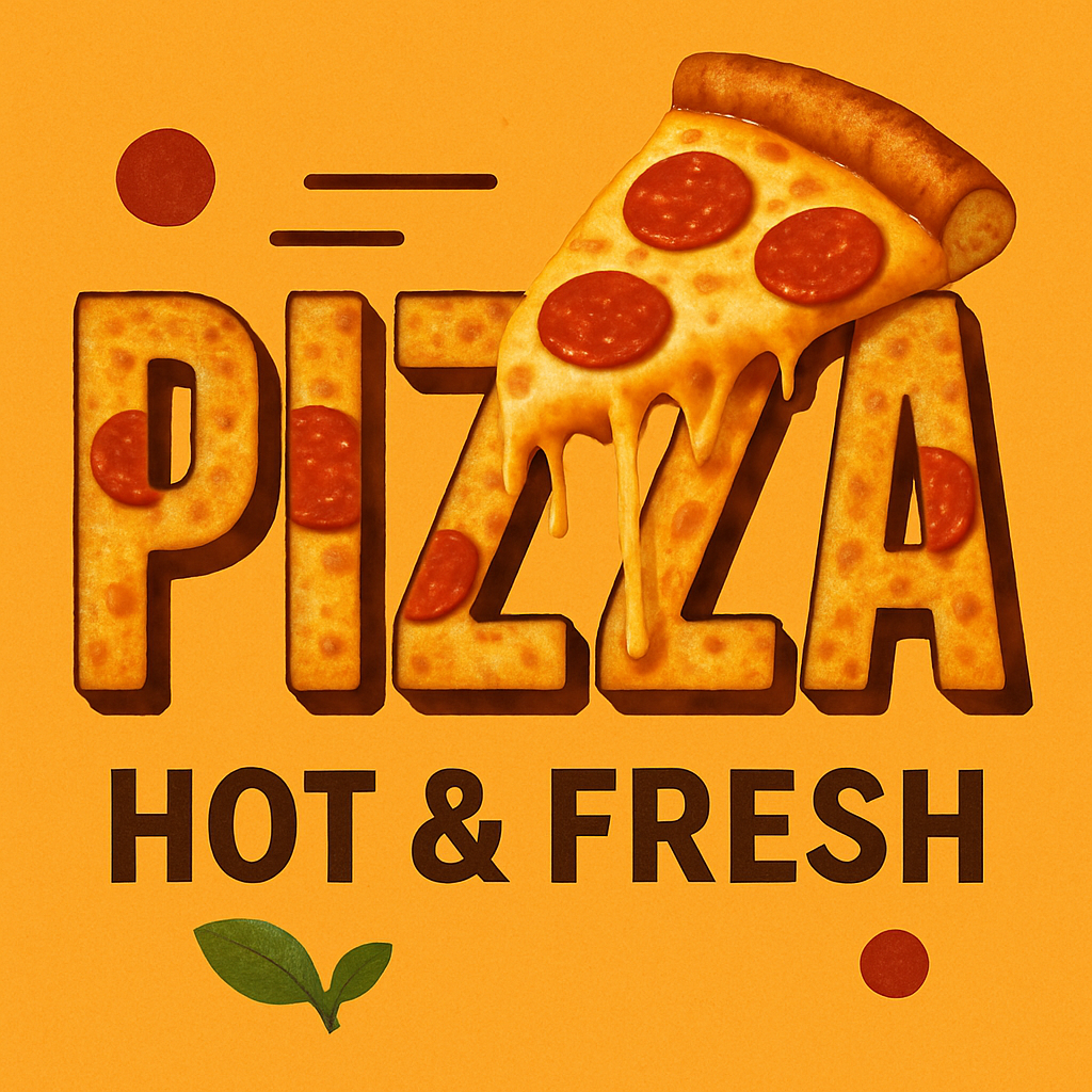 Vibrant graphic featuring a delicious pizza slice with bold, playful typography, ideal for food-related marketing and social media posts.