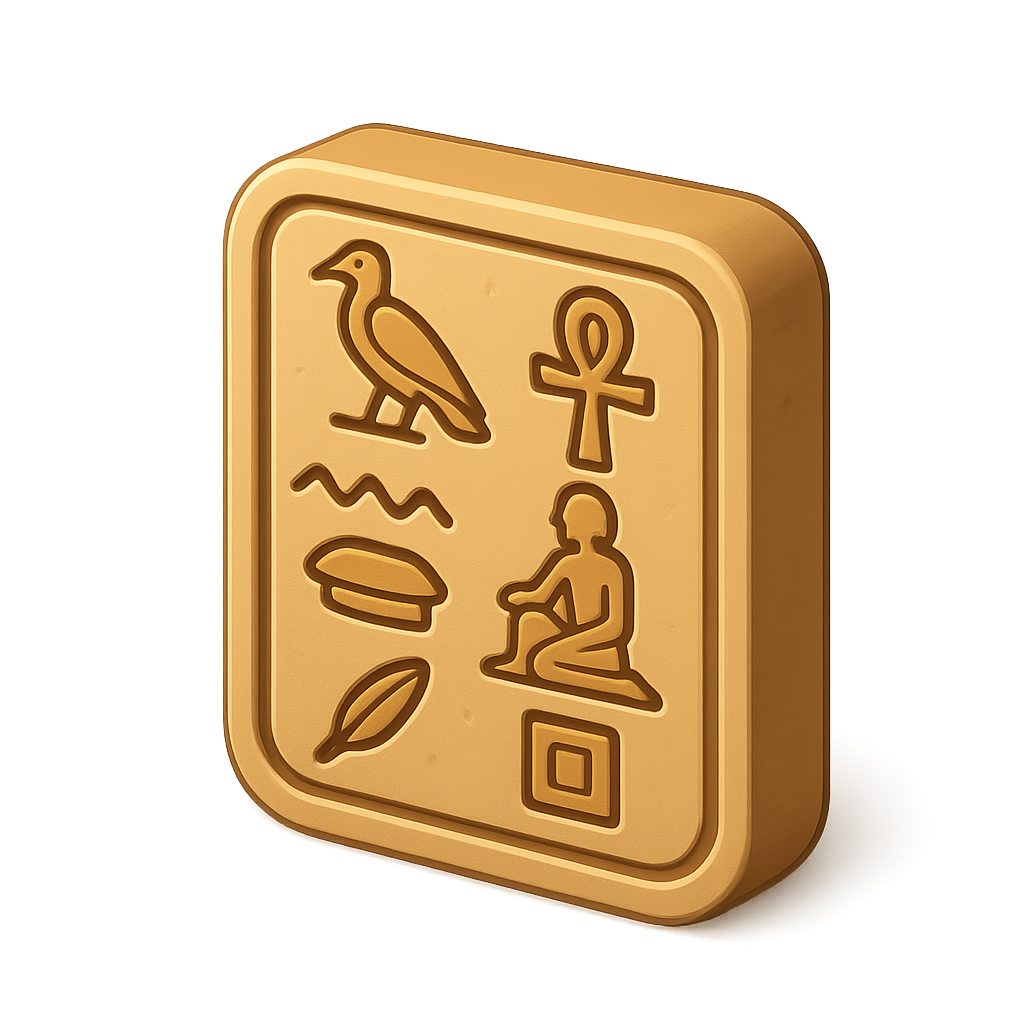 A 3D icon representing Egyptian hieroglyphs, featuring symbols like a bird, ankh, and more. The design is isometric with a volumetric feel, set against a soft gradient background.