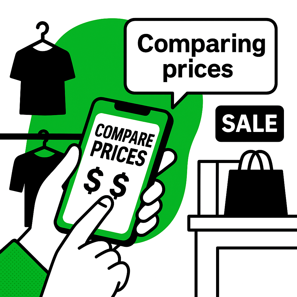 A modern illustration depicting a smartphone displaying price comparison while shopping, ideal for e-commerce and retail marketing.