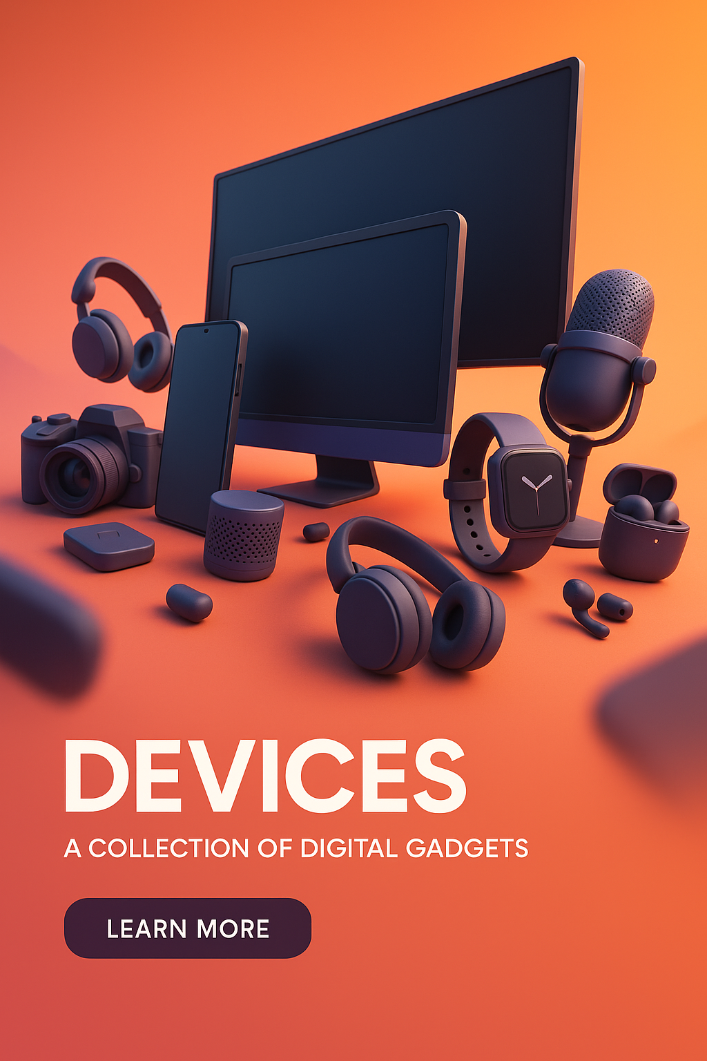 A vibrant graphic showcasing various digital gadgets including headphones, cameras, and smart devices, ideal for tech promotions or e-commerce.