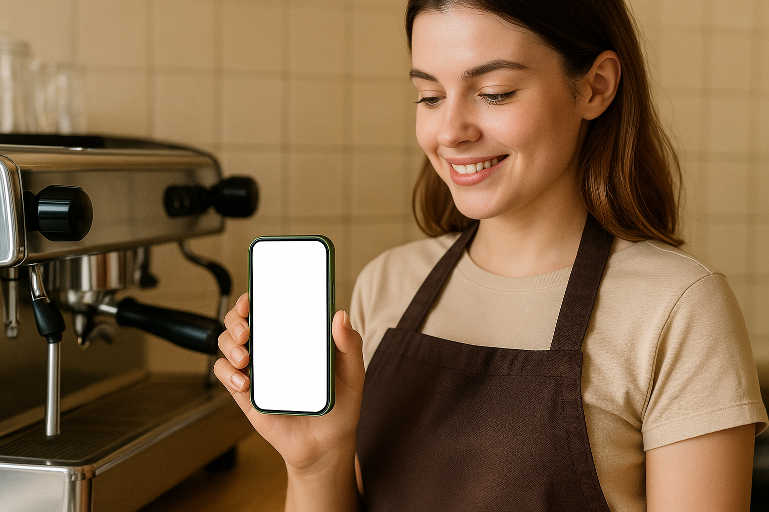 A smiling barista in a brown apron holds a green phone with a blank screen next to an espresso machine, showcasing a friendly coffee shop atmosphere.