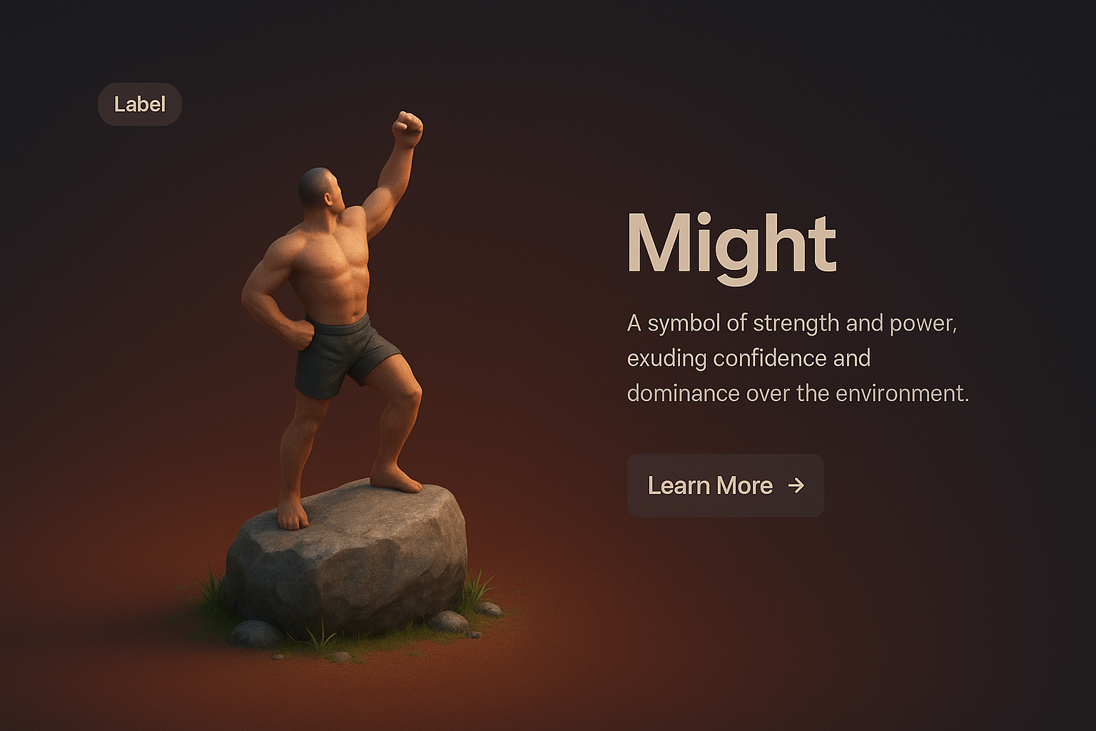 A captivating 3D scene showcasing a muscular figure exuding strength while standing on a rock. The dark gradient background enhances the powerful visual, complemented by a text block.