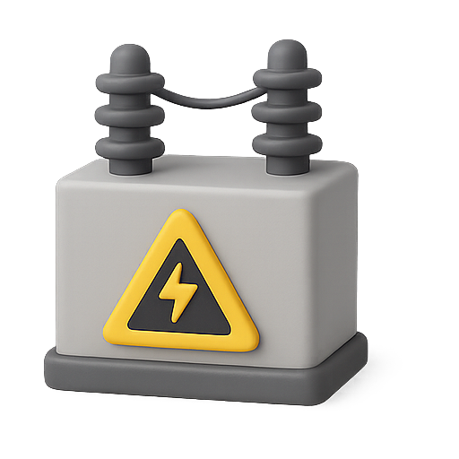 Stylized 3D illustration of a power transformer with high-voltage symbol, designed for use in energy-related graphics, suitable for educational materials or safety awareness.